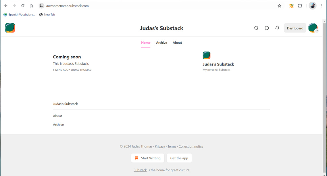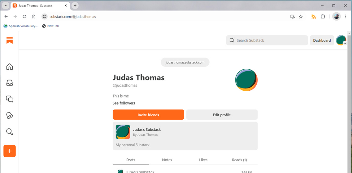 For my example, I didn’t choose an awesome name. I went with Judas Thomas, a variant of Thaddeus Thomas. This is the substack profile page. It’s similar to what you’d see in the app. The menu on the side allow you to explore Notes, the Substack social media. You have “home” and then your “inbox,” you can have your the newsletters you subscribe to sent to your email or the inbox. After that is the “chat” button where you can enter a publication’s chat or another member’s direct messages. Then there’s the “search” and the “post” for when you’re ready to write a note to social media.