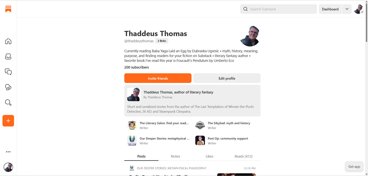 I have multiple Substacks and I get to choose which one I want shown as my main one. I chose mu author site. I have a better bio and beside my address is says “2 links.” That’s because I’ve added links to my X (Twitter) and the website version of my author site. By the way, my address is thaddeusthomas.com. You can use your own custom domain for a one-time fee of $50. All my other sites us the substack addresses.