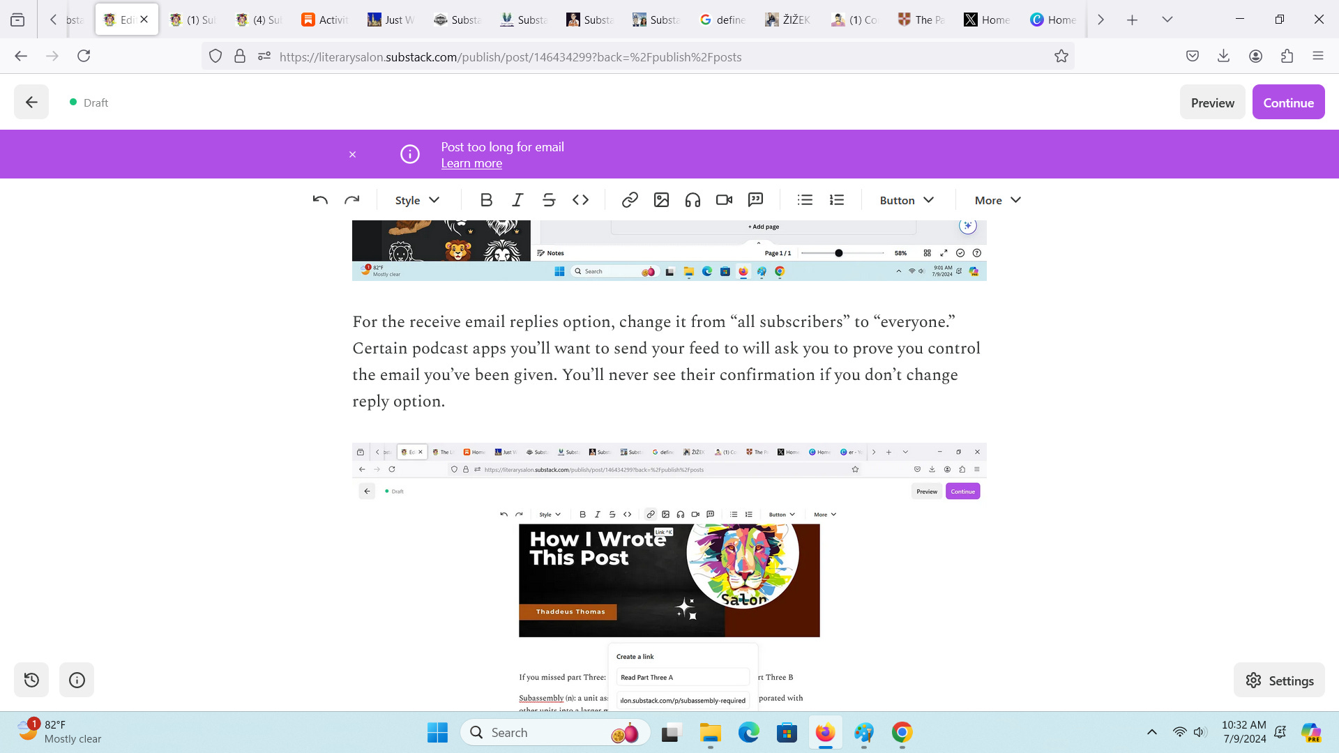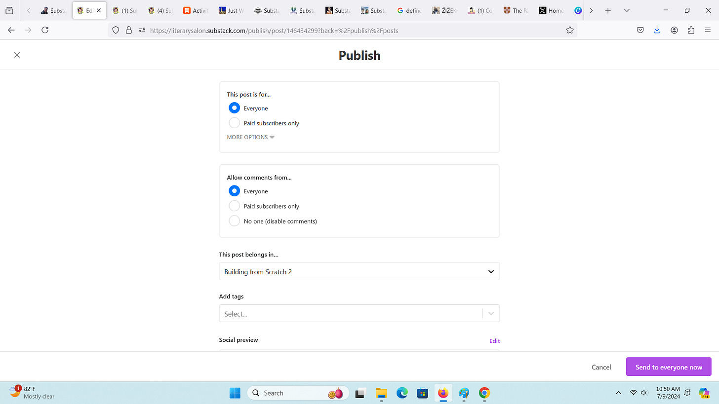 Here you can see there are two subscriber settings, and I’ve unclicked the second. New subscribers will have this section as part of their subscription, but my existing subscribers won’t. Why? Well once I’m done with this series, it won’t matter. A post can be changed but it won’t email twice, to avoid spamming. Current new subscribers may be part of the group I’m asking to join us from X or elsewhere, and they’ll get new episodes in the mail. My existing mailing list won’t.