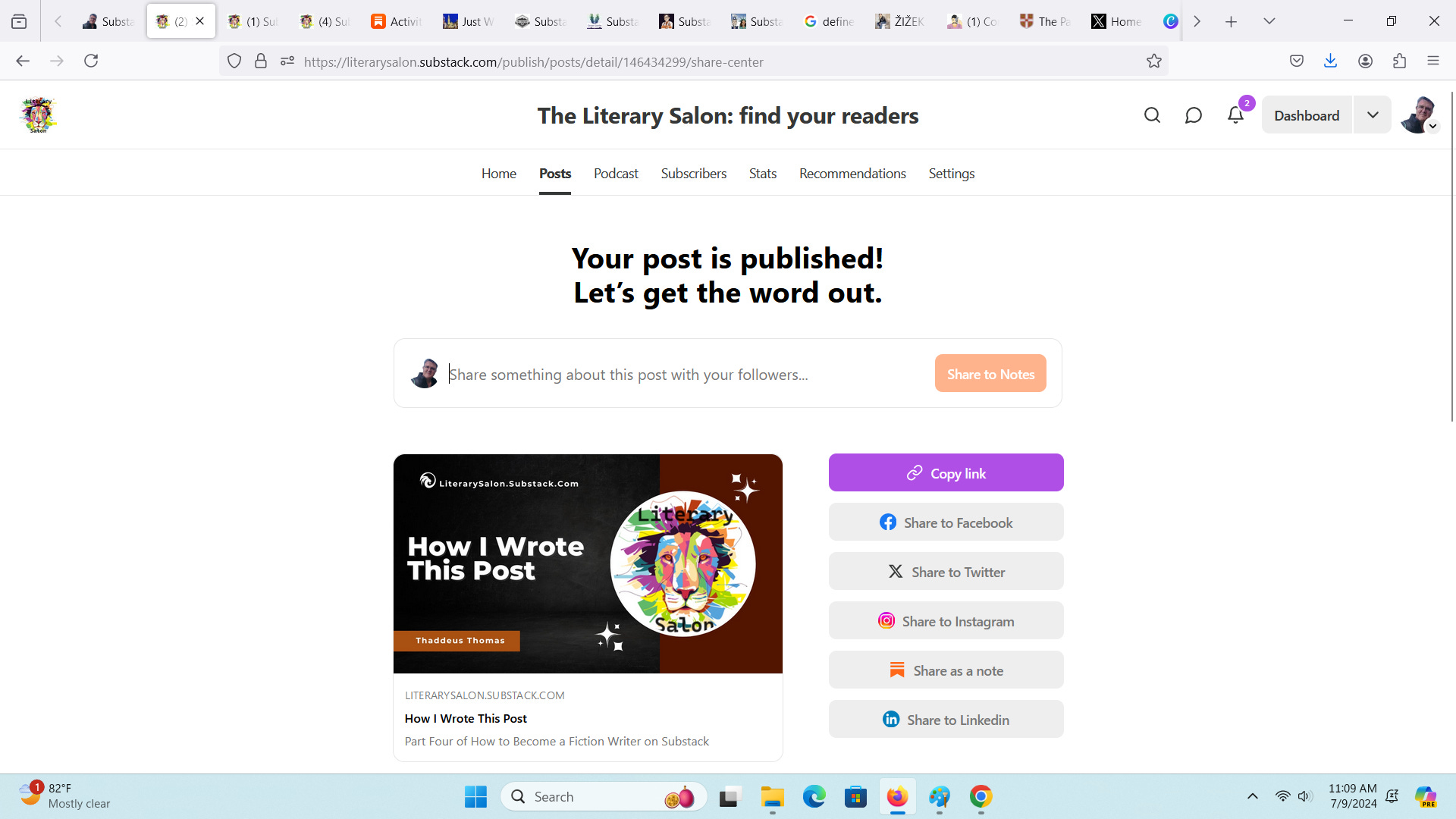 Now, I’m given some easy options to share the post. If you scroll down, you have a selection of images designed for different social media. At the top, there’s a spot where you can write something and then click the “Share to Notes.” It’s easy. These link connect people to the app version of the post, and I know on writer who says he prefers how the posts look in the app. This fact used to bother me, and I’d go out of my way to copy the webpage link and use that.