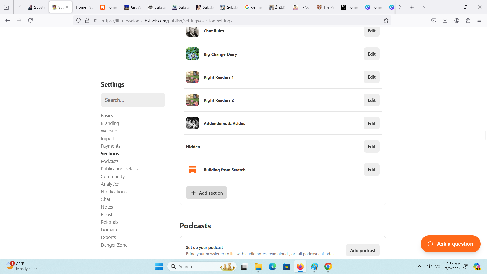In Settings I scrolled down to Sections, and you can see my list of existing Sections below. I click the button, “Add Section.”