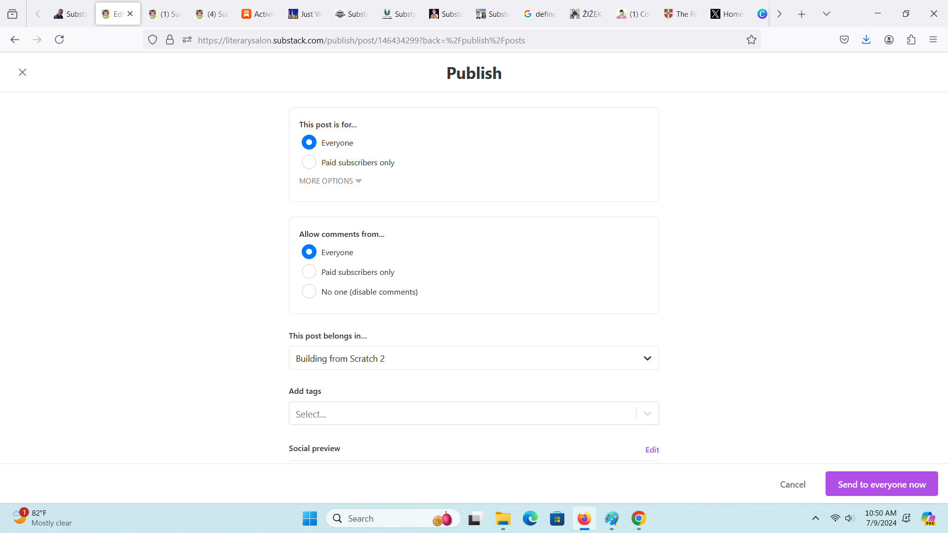If you have paid subscriptions set up, you’ll choose who can see the post and who can comment on it. You can change the Section here and add tags. You can also create tags here by typing something into space provided.