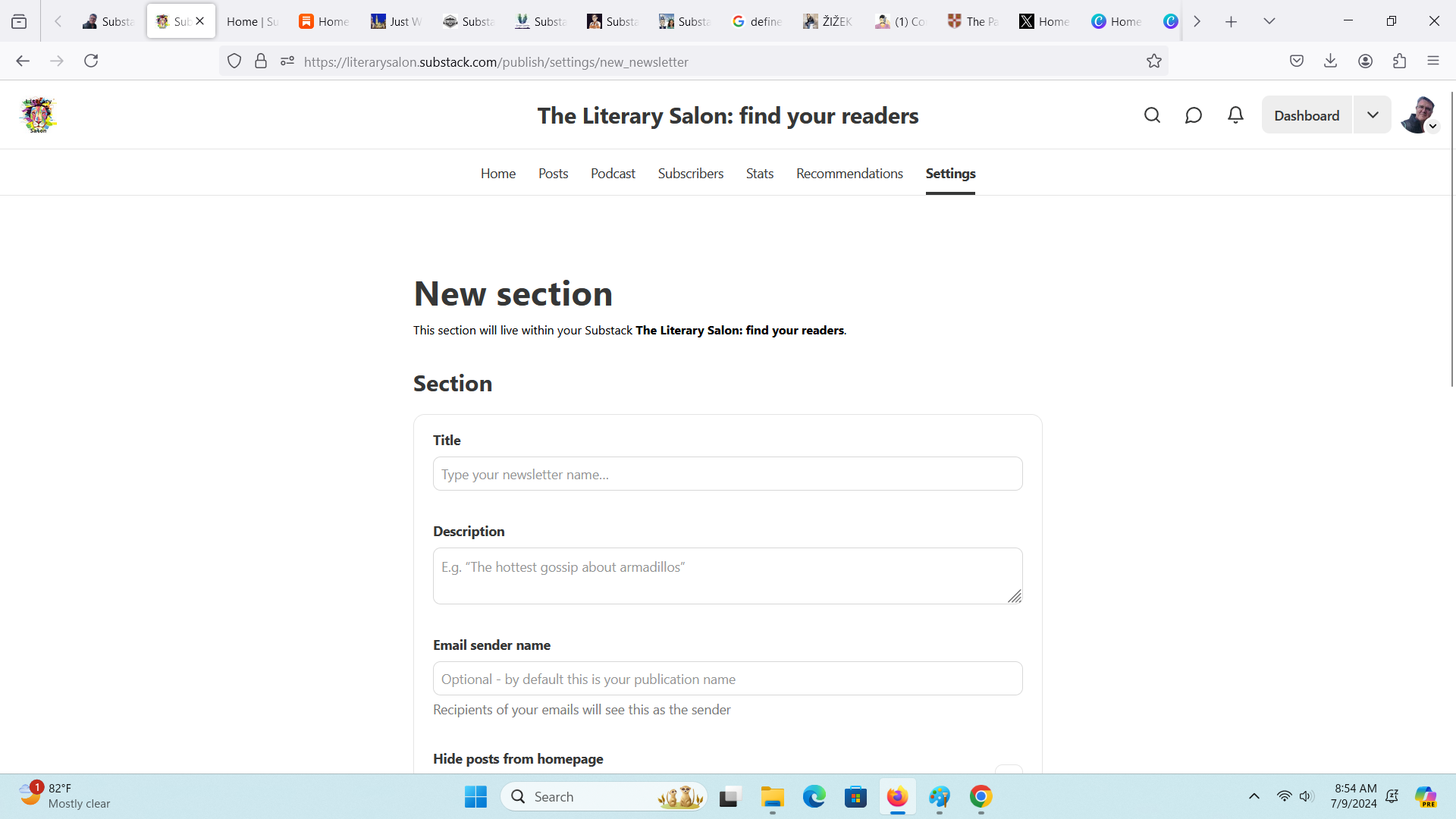 Normally, I’m not creating a section before I write a post, but I know my plan and I’m setting it up in advance because at some point during the writing, I will need to select a section. You won’t for as long as you’ve not set up sections, but once one is set up, the system will require that every post be assigned one. There is an automatic section with the title of your publication. If your post doesn’t fit in any section you created, you just assign it that one.