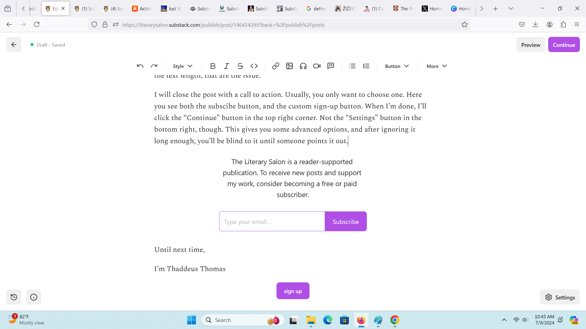 I will close the post with a call to action. Usually, you only want to choose one. Here you see both the subscribe button, and the custom sign-up button. When I’m done, I’ll click the “Continue” button in the top right corner. Not the “Settings” button in the bottom right, though. This gives you some advanced options, and after ignoring it long enough, you’ll be blind to it until someone points it out.