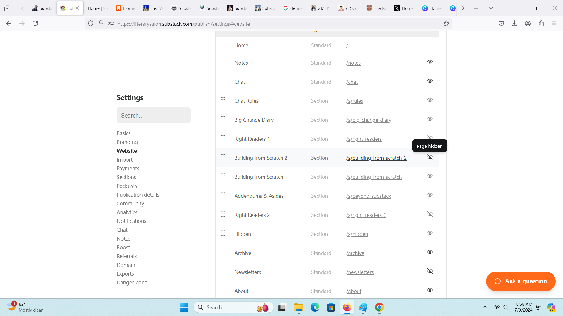 Sections can appear as menu items at the top of the website, but I don’t want all the sequels up there. So I go to Website under Settings, scroll to Navigation, and I hide the Sections I don’t want to appear in the menu. You can also add pages or tags to navigation. Looking at this screenshot, I can see that one of the standard options, Notes, is visible. This allows people to see all the recent notes you’ve posted. My menu is in danger of becoming cluttered, so I’ll hide that. If you enable chat, it too can appear in the menu. Chat is important to the operation of this publication, so I’ll keep that link visible.