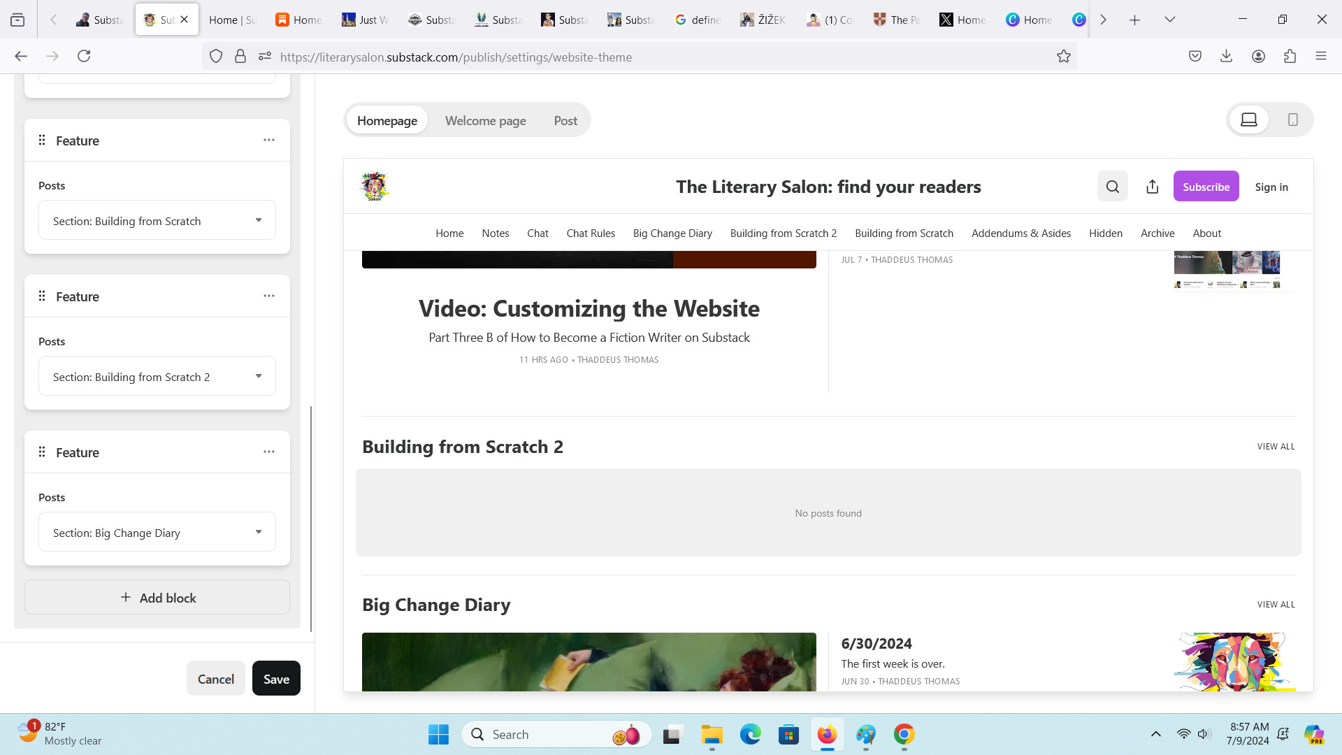 I also know my plan for how I want the post displayed, so I return to the customize button and add a new block for Building from Scratch 2. Nothing will appear on the actual website until there’s a publish post to fill it.